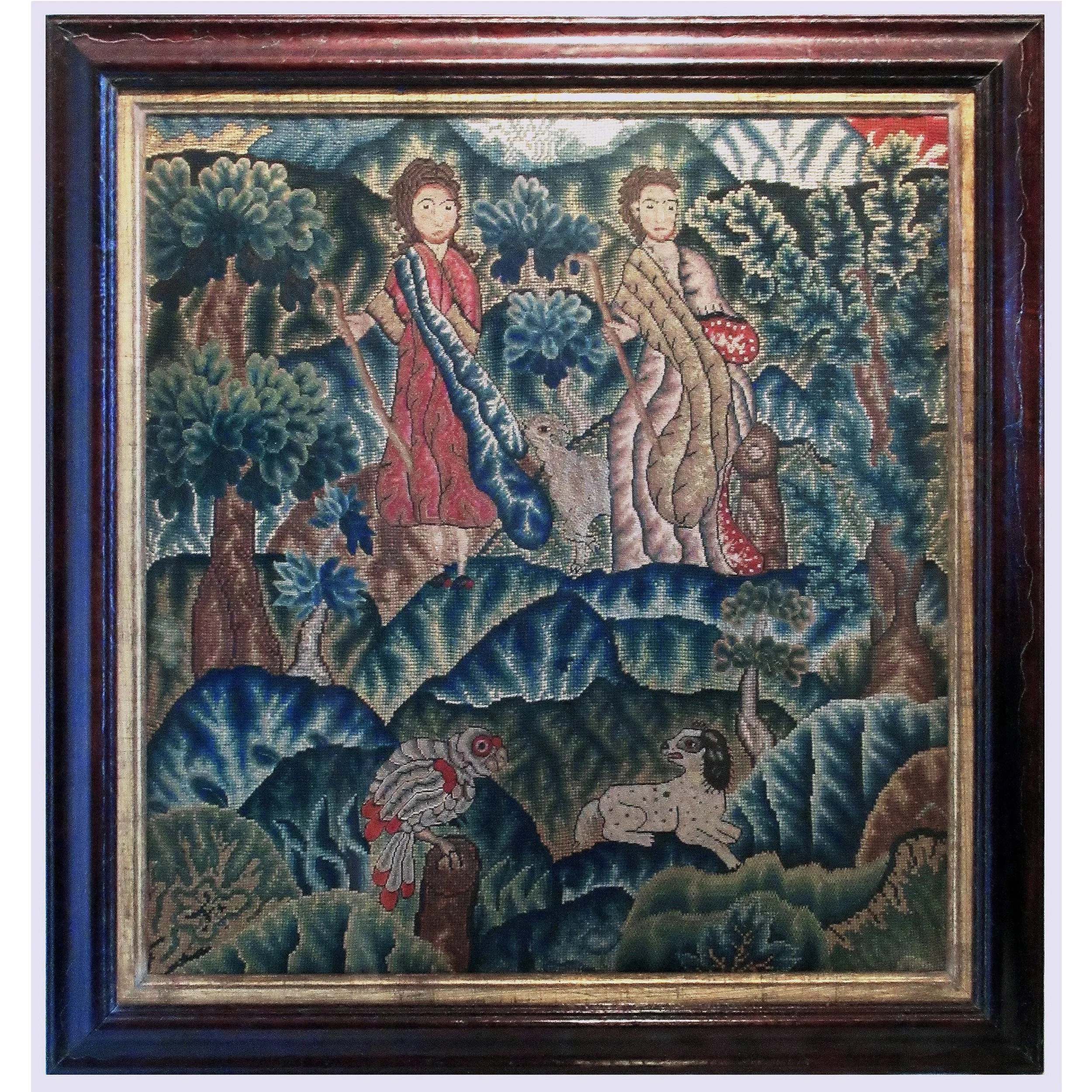18th century English needlework - shepherds - parrot - Textile Antiques - Joseph Sullivan