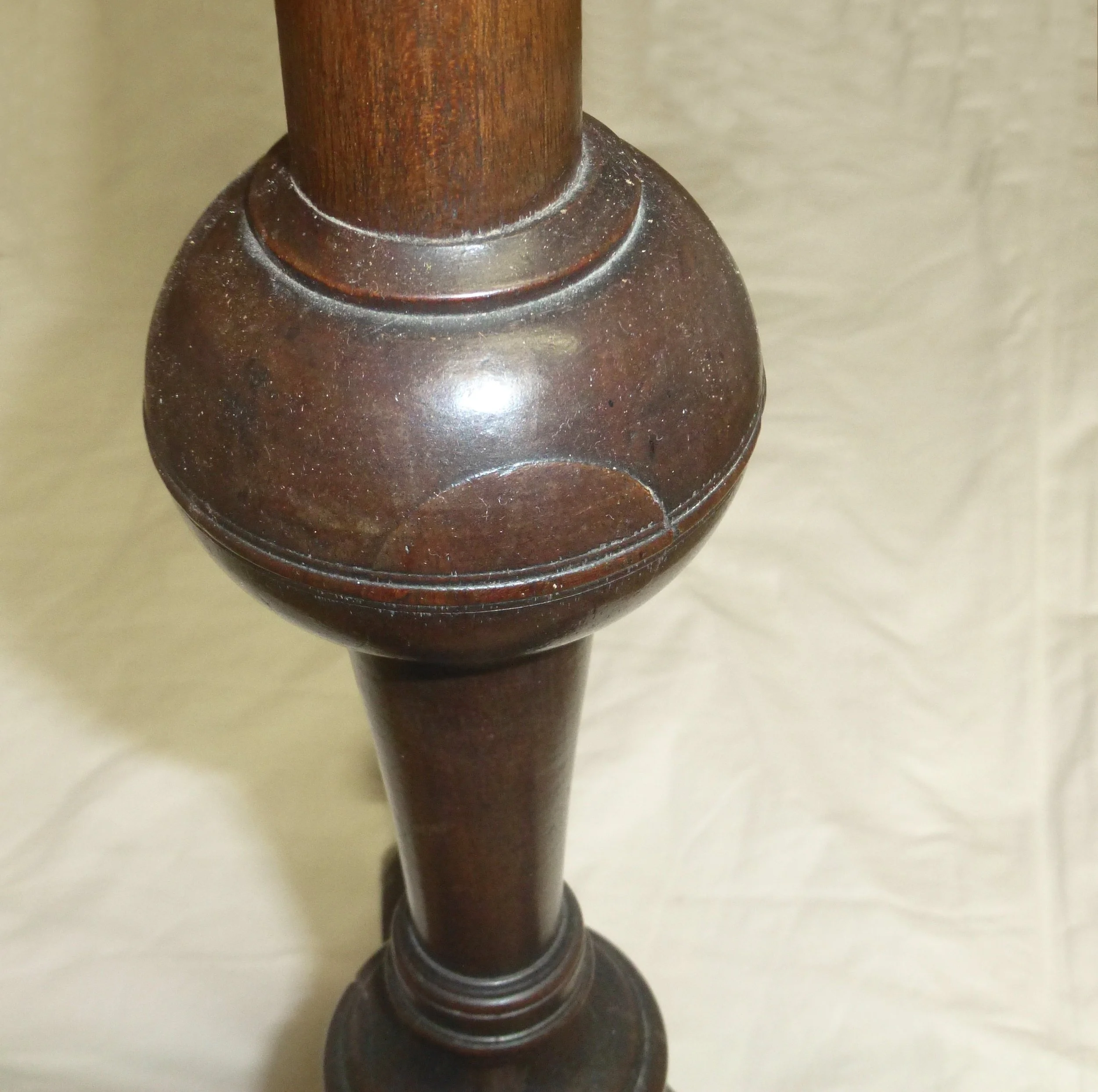 Worked in silk and wool with an urn of flowers against an umber ground. With a mahogany frame and supported as a pole screen on an 18th century and later turned mahogany pole with a ball-knop and flower carved and scrolling tripod base.