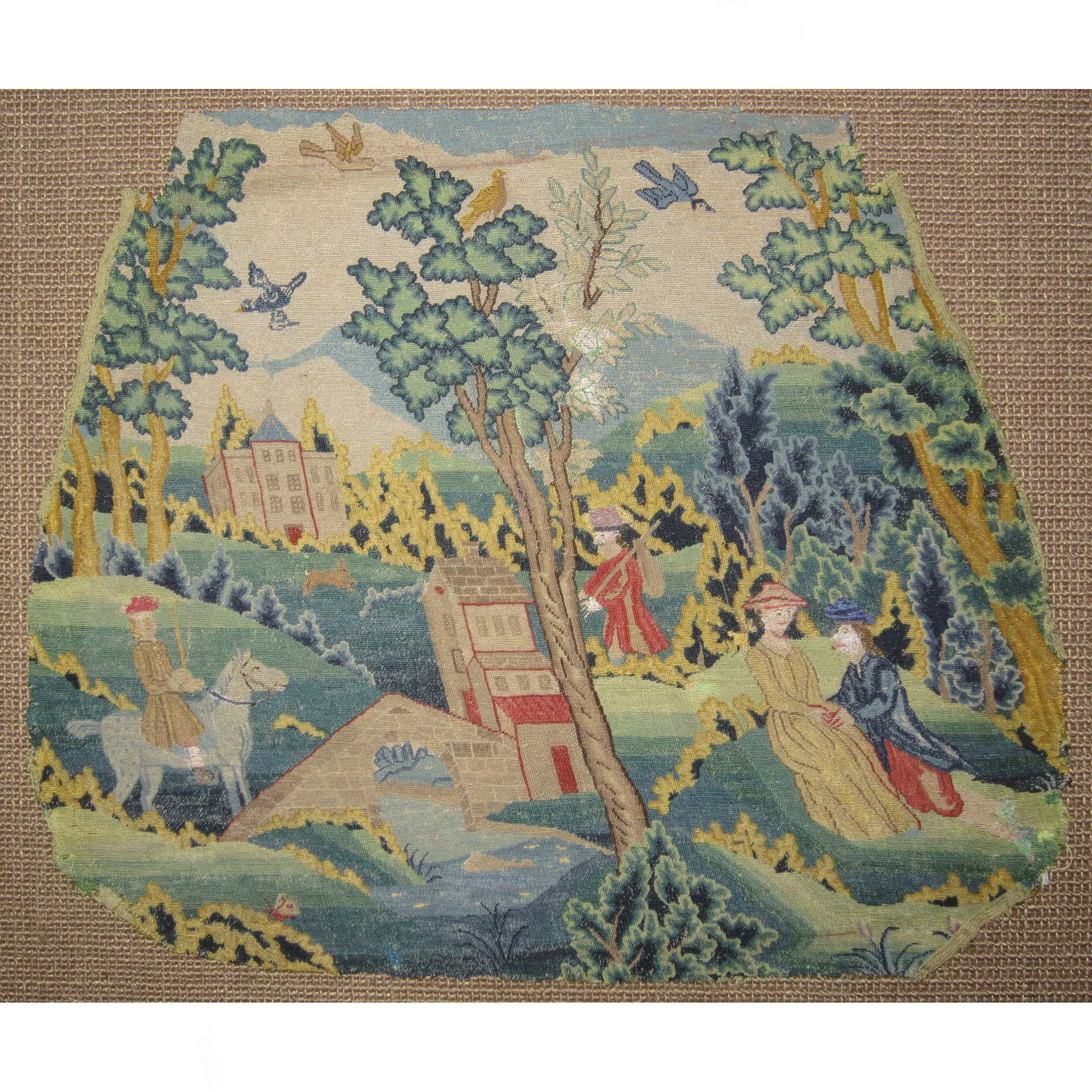 Circa 1715-1720. With a courting couple, a traveller, and a horseman in a wooded rolling landscape, with a bridge spanning a river, and a country house beyond. Cut to fit a chair seat.